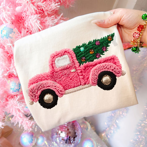 Faux Yarn Pink Truck Ivory Tee