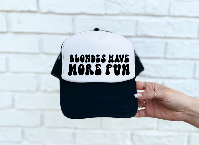 "Blondes Have More Fun" design direct-to-film printed on a Black & White foam trucker hat. The perfect accessory to make a bold statement!