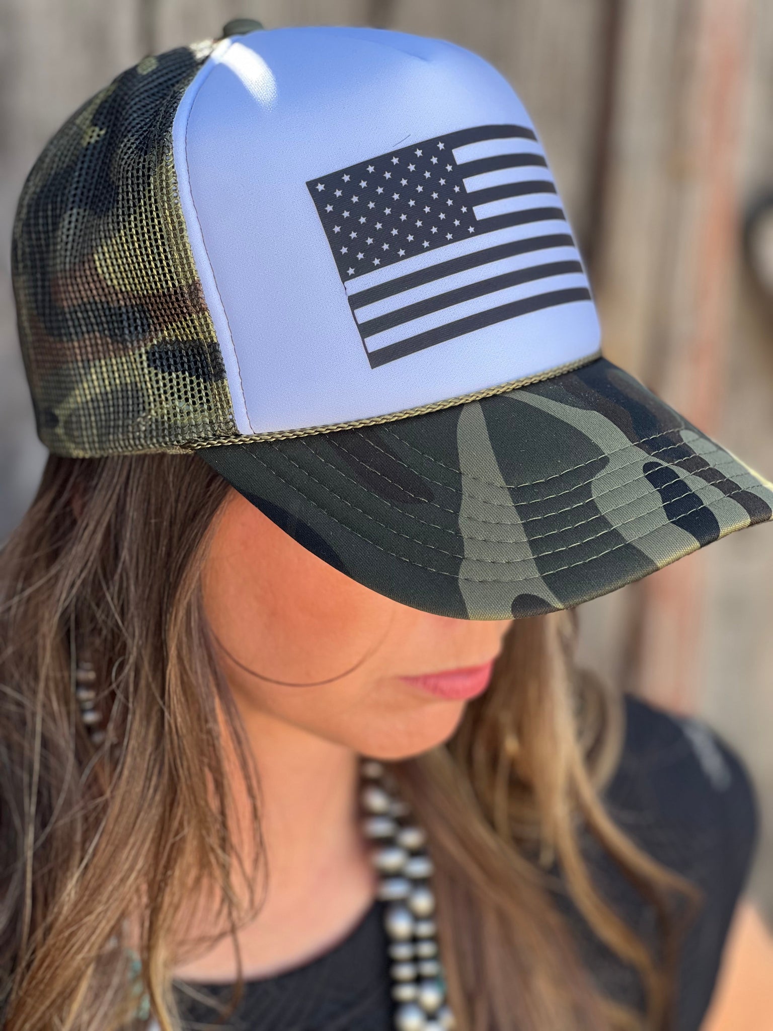 (COLLECTIVE) USA Flag on Camo Foam Trucker Cap