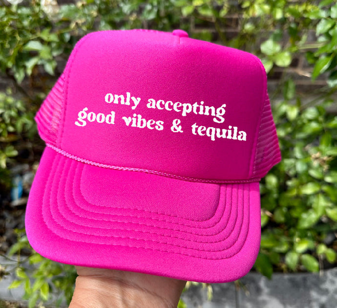 "only accepting good vibes and tequila" design direct-to-film printed on a Hot Pink foam trucker hat. The perfect accessory to make a bold statement!