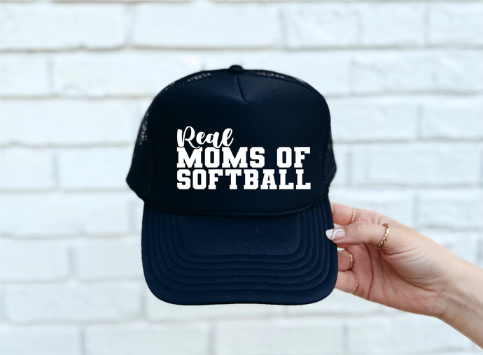"Real Moms of Softball" design direct-to-film printed on a Black foam trucker hat. The perfect accessory to make a bold statement!