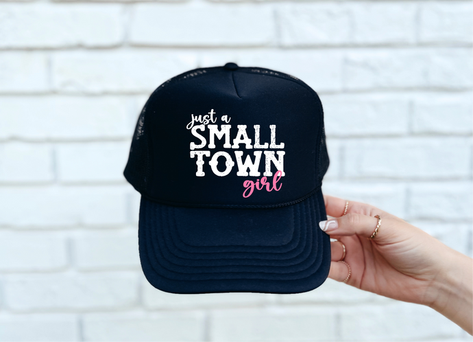 "Just a Small Town Girl" design direct-to-film printed on a Black foam trucker hat. The perfect accessory to make a bold statement!