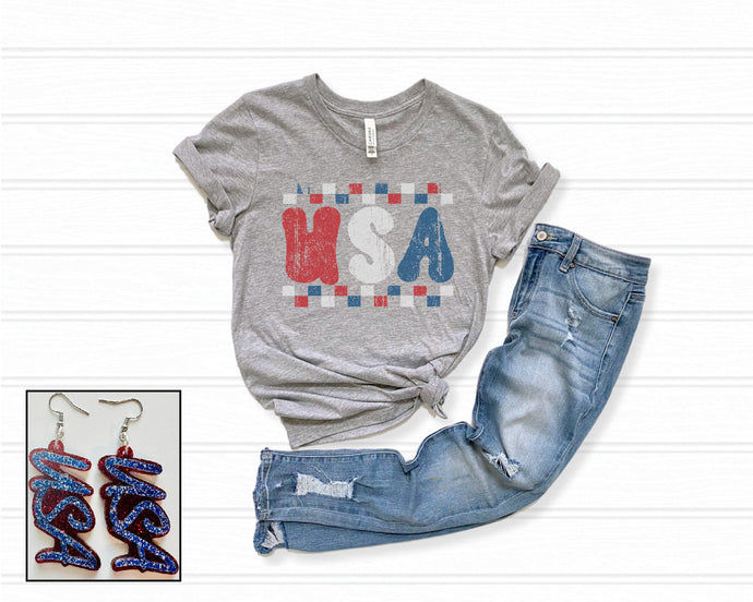 This tee pairs perfectly with our Glitter USA Earrings!